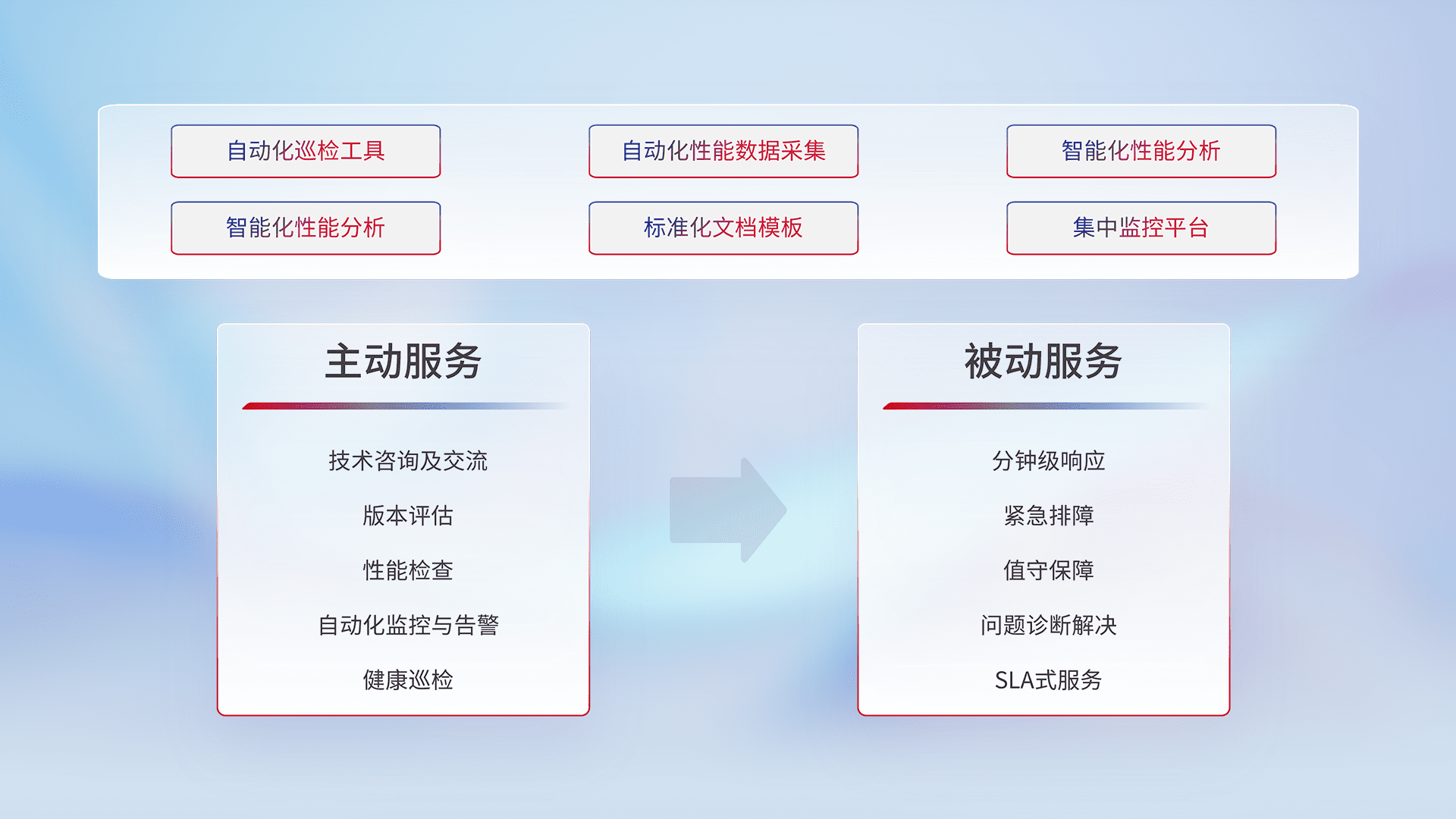 智能化工具和标准化文档,,,,保障服务质量,,提供主动服务(包含技术咨询、、、版本评估、、性能检查、、自动化监控与告警、、健康巡检)和被动服务包含(分钟级响应、、、、紧急排障、、、、值守保障、、问题诊断解决、、SLA服务)。。
